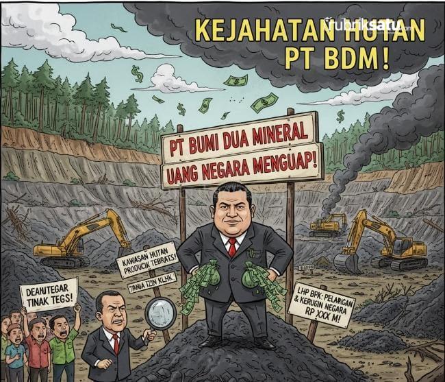KOLUT, rubriksatu.com – Bau busuk praktik tambang ilegal kembali menyeruak di Sulawesi Tenggara. Badan Pemeriksa Keuangan (BPK) Republik Indonesia mengungkap indikasi kuat kejahatan kehutanan dan pelanggaran berat perizinan tambang di Kabupaten Kolaka Utara (Kolut).